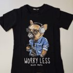 Zwart shirt van Squared & Cubed, met de opdruk van een hond met koptelefoon met de tekst worry less music more